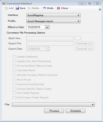 The Conversion File interface screen is used to facilitate the importing process of various files into TSM. Those files load data into TSM so that transactions can be created, indicative data updated, investment data updated, etc. The file is created using the format from the Profile Maintenance screen, and must then be uploaded into TSM through File>Upload prior to using the Conversion File screen.