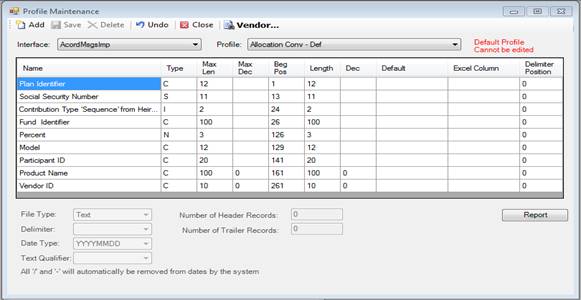 This is the file type that was chosen when the new Profile was added. The entries are either Excel, Text or Delimited, and cannot be changed for an existing default profile. |