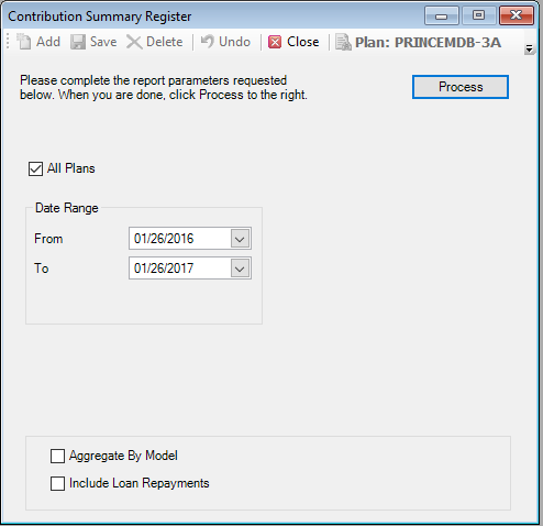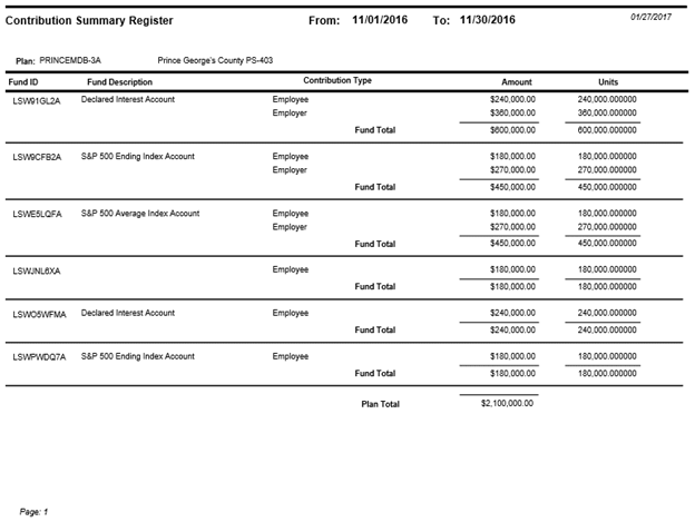 Use the Contribution Summary Register option to view a breakdown of contributions processed during a specific time period by fund allocation, type, dollar amount, and number of units/shares. You can generate this report for one Plan or all Plans.