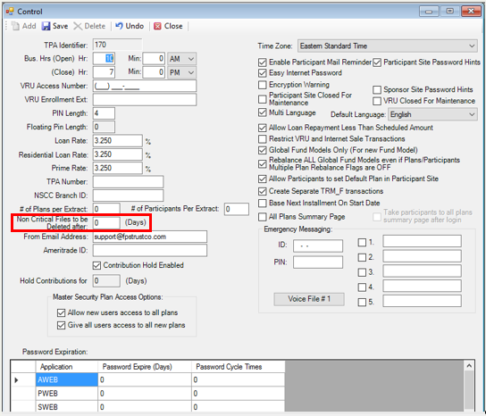 EXAMPLE: If the value of ‘90’ is entered in the "Non Critical Files to be Deleted After Days" field on the Setup > System > Control screen and the current date is 3/1/2005, then all files with a date older than 12/1/2004 (i.e. 90 days prior to 3/1/2005) will be deleted when the Run System Delete Job button is clicked.