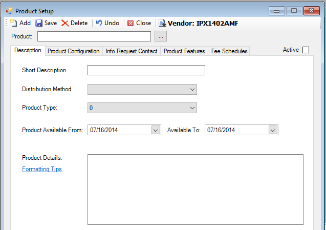 1. Go to Setup > Products > Product. The Product Setup window is displayed.